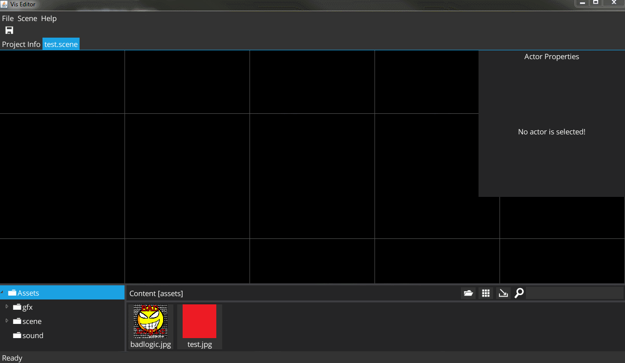 VisSceneEditor was a prototype of VisEditor. It allowed moving, resizing and rotating objects on scene. It was running on top of LibGDX game, so editor view was actually in real time. Work flow with it, was like this: open game, enter edit mode, place objects where you want them to be, save scene. Next time you will open your game, saved scene will be load automatically.